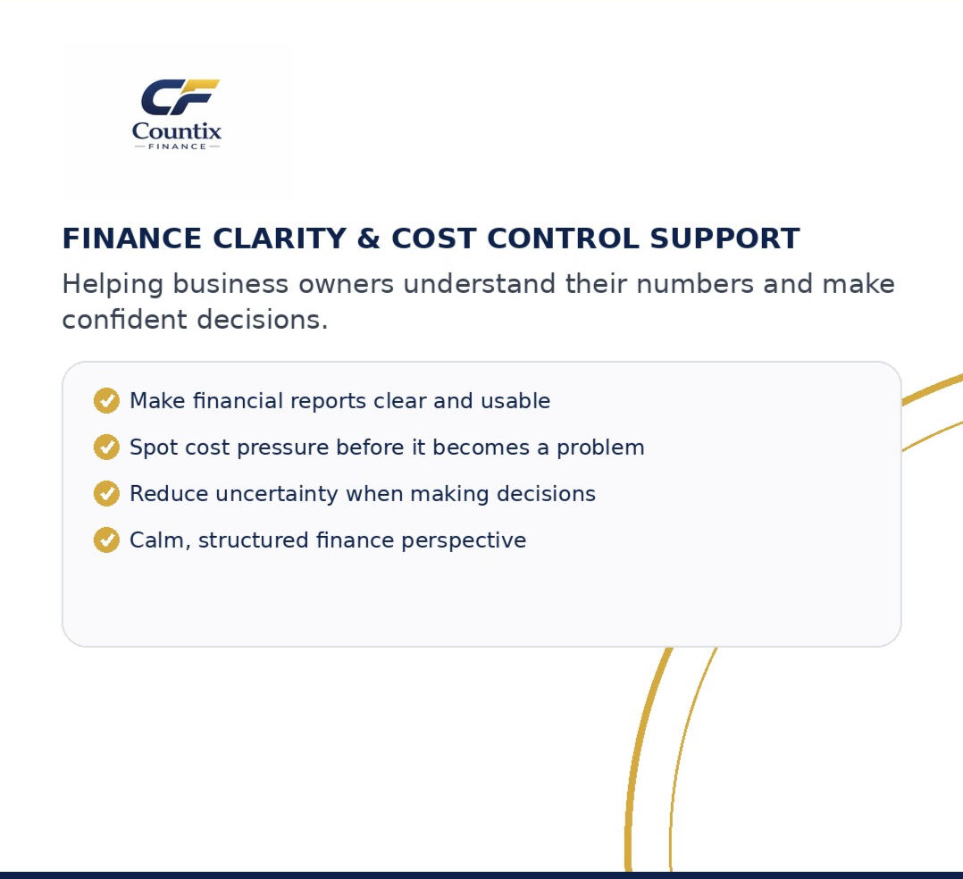 Help owners feel more in control as the business grows.Get in touchBased in London, United Kingdom, Countix Finance supports business owners globally through remote, independent finance insight.If the numbers don’t feel clear, don’t guess.